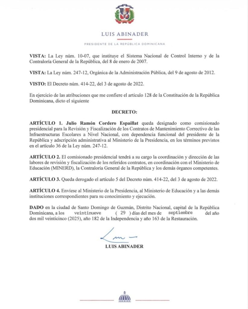 Santo Domingo.- El presidente Luis Abinader, emitió el Decreto 569-25, mediante el cual designa a Julio Ramón Cordero Espaillat como Comisionado Presidencial para la Revisión y Fiscalización de los Contratos de Mantenimiento Correctivo de las Infraestructuras Escolares a nivel nacional, con dependencia funcional del presidente de la República y adscripción administrativa al Ministerio de la Presidencia, en los términos previstos en el artículo 36 de la Ley núm. 247-12.