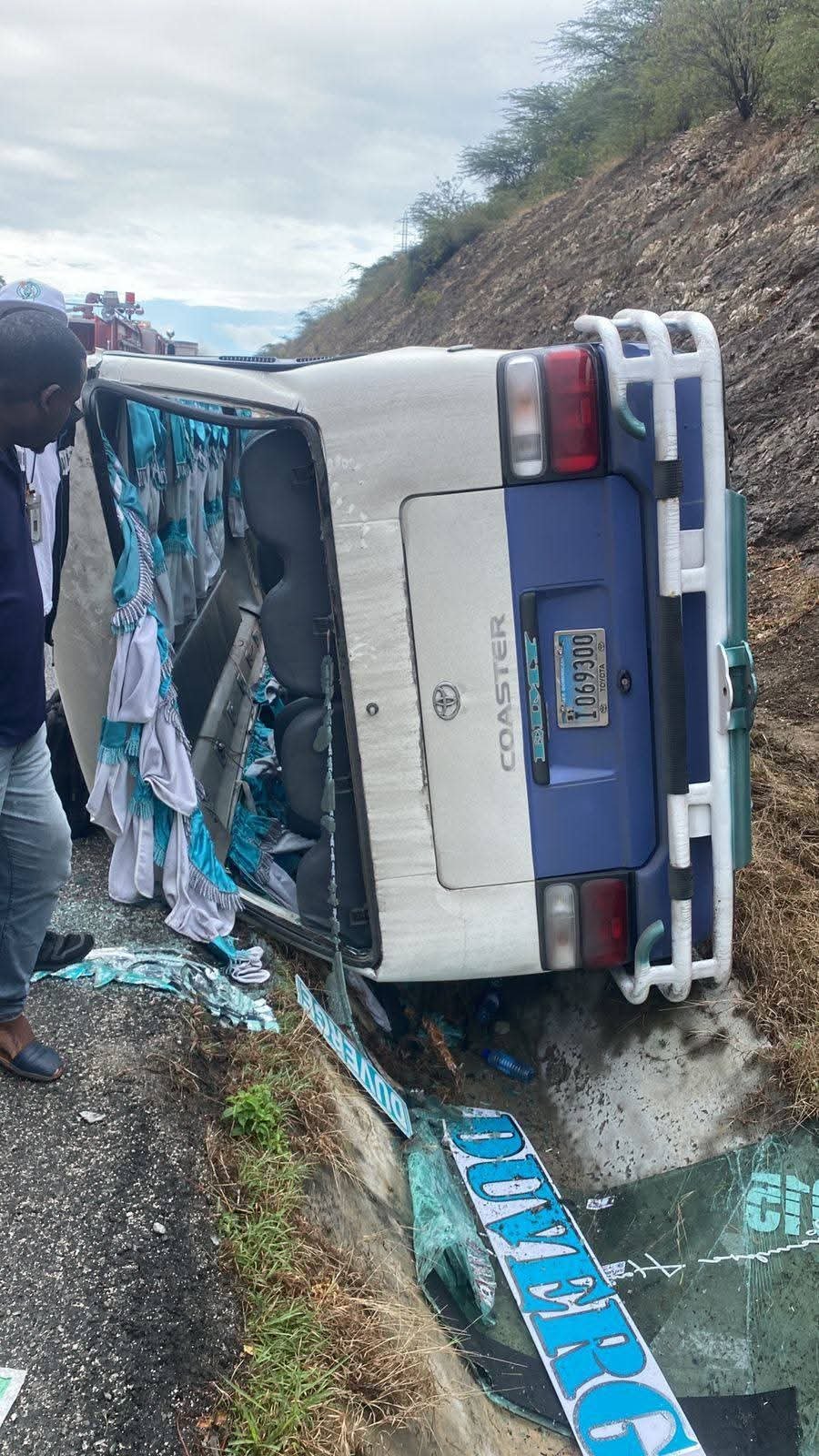 Azua, R.D.– Un minibús de transporte público sufrió un deslizamiento la mañana de este viernes en la peligrosa curva de la conocida bajada del Número, próximo a la comunidad de Atilio, en la carretera Sánchez.