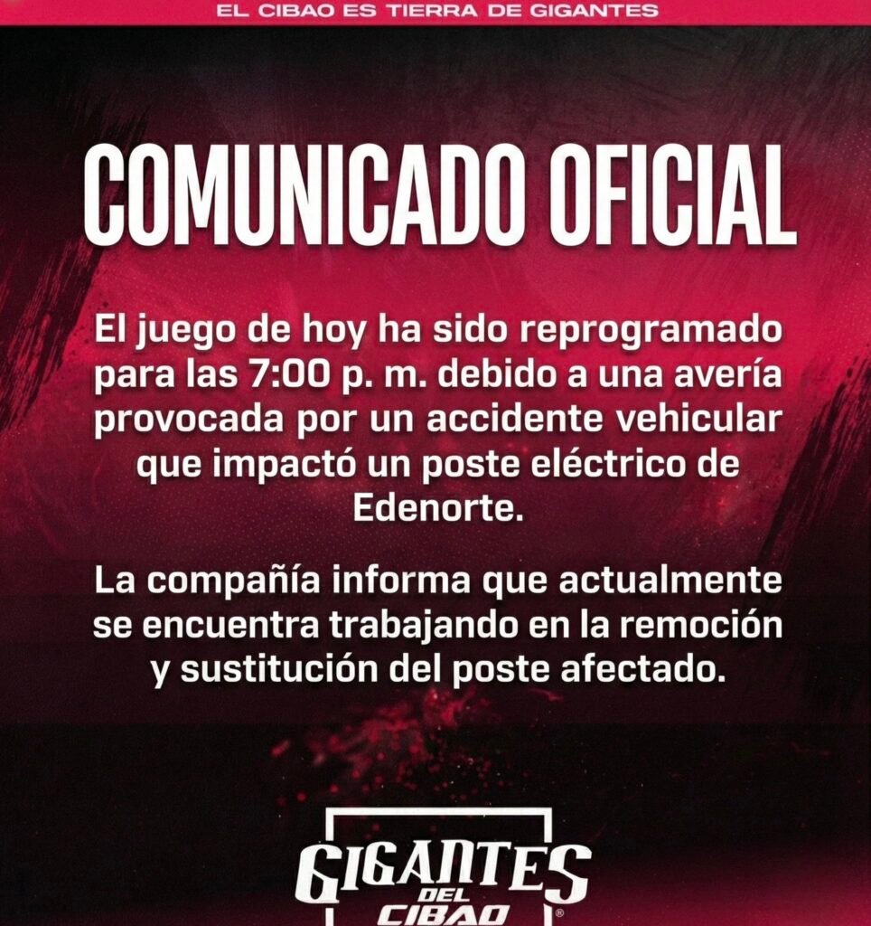 “El juego de hoy ha sido reprogramado para las 7:00 p. m. debido a una avería provocada por un accidente vehicular que impactó un poste eléctrico de Edenorte. La compañía informa que actualmente se encuentra trabajando en la remoción y sustitución del poste afectado”.