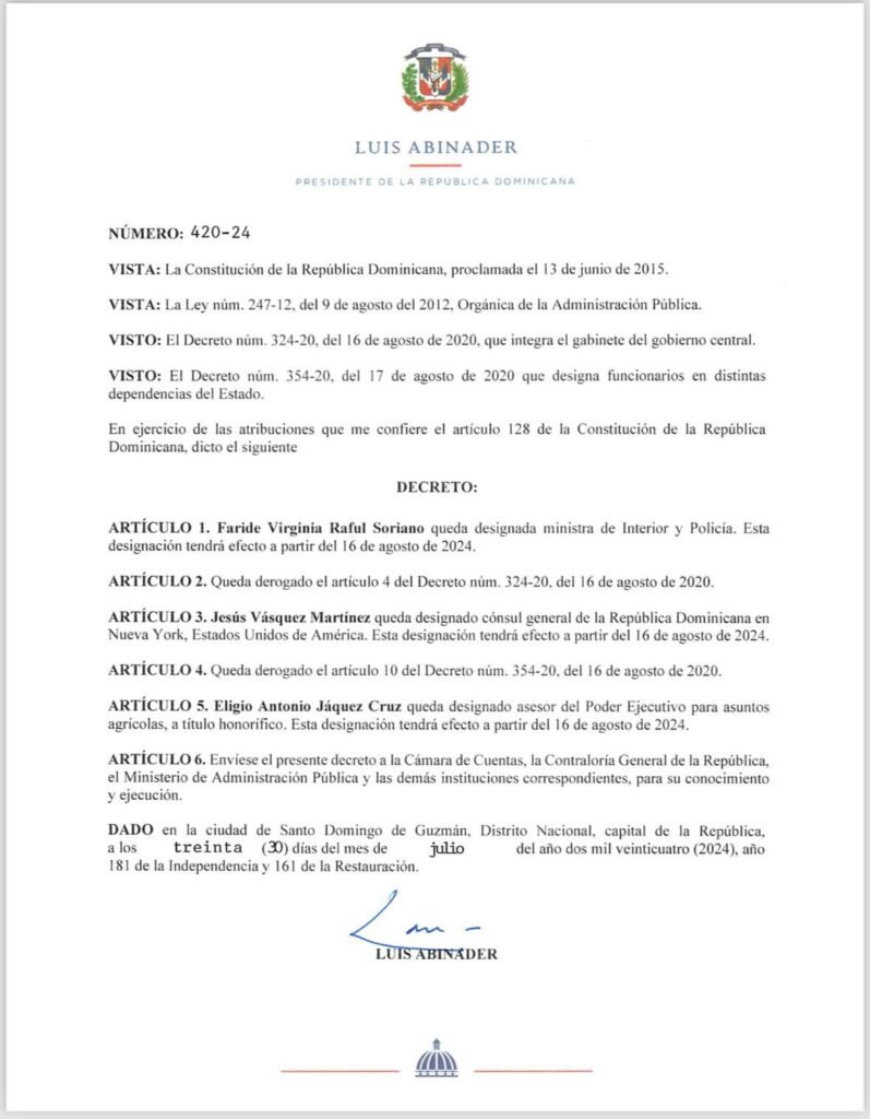 La información la dio a conocer el propio Abinader a través de un mensaje publicado en sus redes sociales, en el cual destaca la trayectoria de Raful en defensa de los derechos fundamentales de las mujeres, niños y niñas.