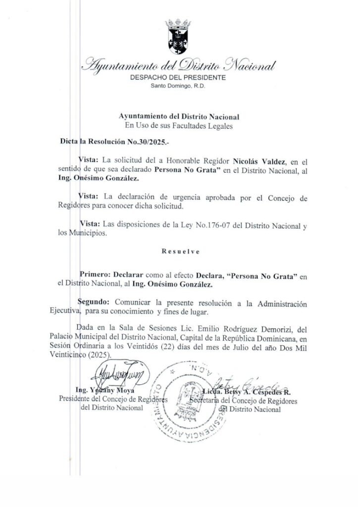 En estos días se ha debatido el tema sobre la pertinencia o no de declarar a Amauris Peña como persona no grata en el municipio Duvergé. Lo primero que debemos resaltar es que existe un precedente o una jurisprudencia de esa solicitud y es la Resolución número 30/2025 de fecha 22 de julio del año 2025, dictada por el Concejo de Regidores del Ayuntamiento del Distrito Nacional que declaró al Ing. Onésimo González Persona No grata en el Distrito Nacional, dicha Sesión Ordinaria se conoció sin la presencia del señor Onésimo González, ni de ninguna parte acusadora, pues se conoció de manera administrativa.