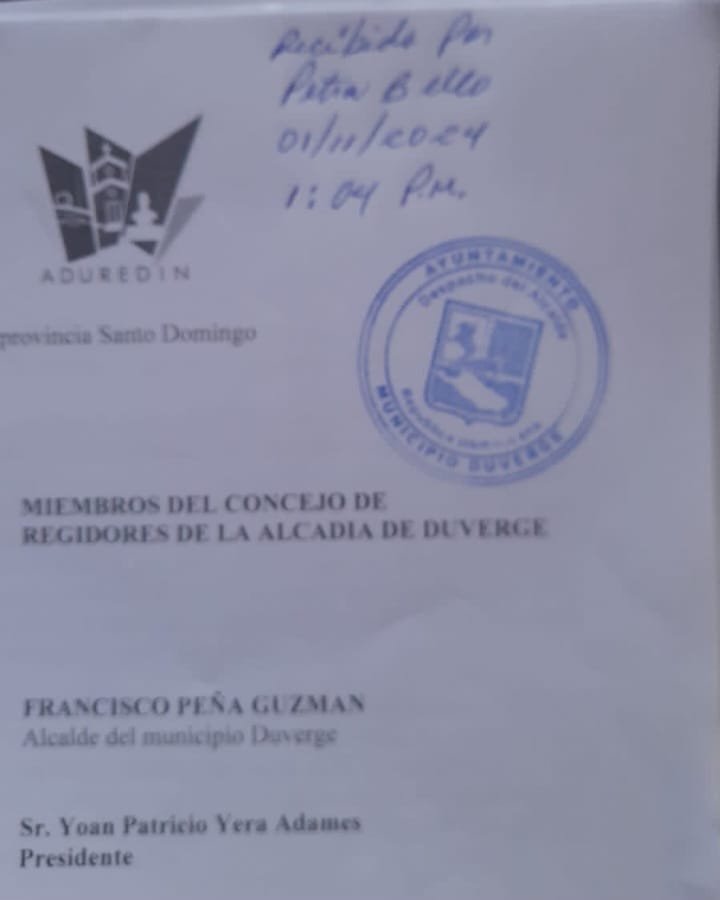 La solicitud que hizo Aduredin a petición del entonces miembro del Concejo de Regidores y hoy presidente del Concejo Bartolo Peña, fue depositada el uno (1) de noviembre del año 2024, fecha en que Peña García había motivado y organizado a un grupo de invasores para que tomarán posesión del club de los duvergenses ubicado en el sector El Almirante, municipio Santo Domingo Este, entre los cuales existían acuerdos de quedarse con los beneficios que generaban los locales y los demás espacios del club.