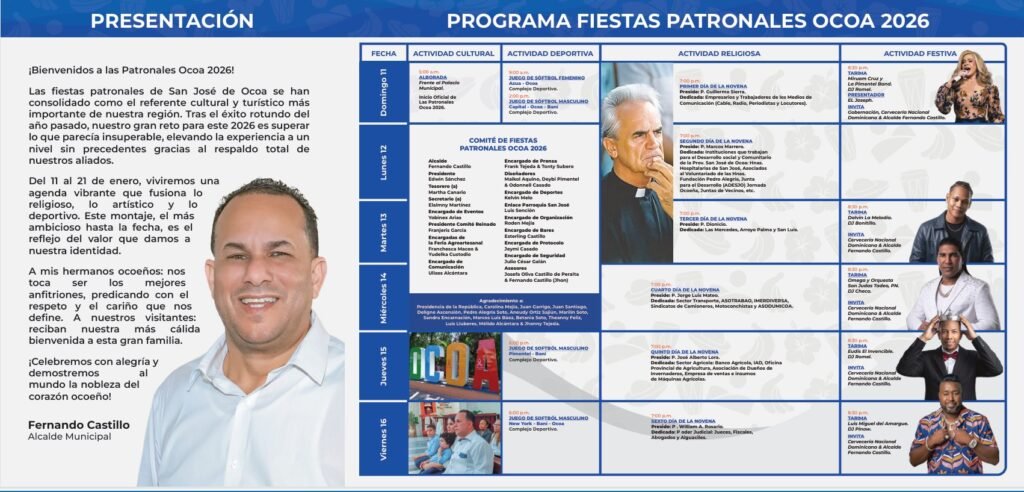SAN JOSÉ DE OCOA – En un ambiente de júbilo y determinación, el alcalde Fernando Castillo encabezó hoy una concurrida rueda de prensa en el Palacio Municipal para anunciar los detalles de las festividades que ha definido como el evento que el pueblo merece.