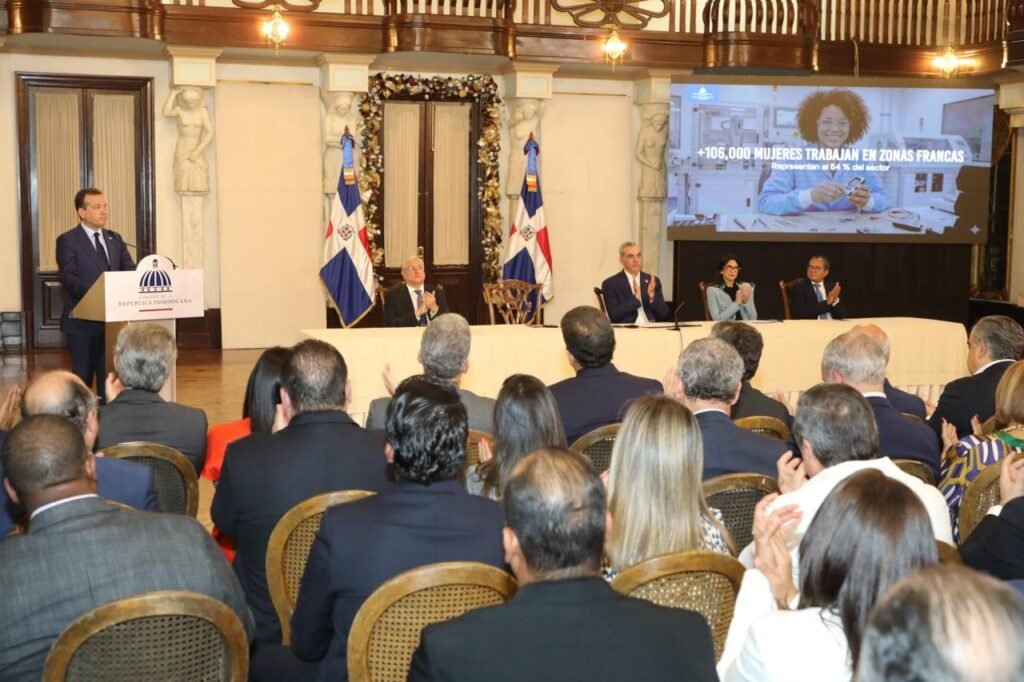 Santo Domingo. – El presidente Luis Abinader, junto al ministro de Industria, Comercio y Mipymes, Víctor -Ito- Bisonó, encabezó un encuentro con representantes del sector zonas francas, que a octubre de este 2025, registró su máximo histórico de 200,134 empleos directos, consolidándose como uno de los principales motores de crecimiento económico y social del país y uno de los ecosistemas industriales más dinámico y confiable del hemisferio.